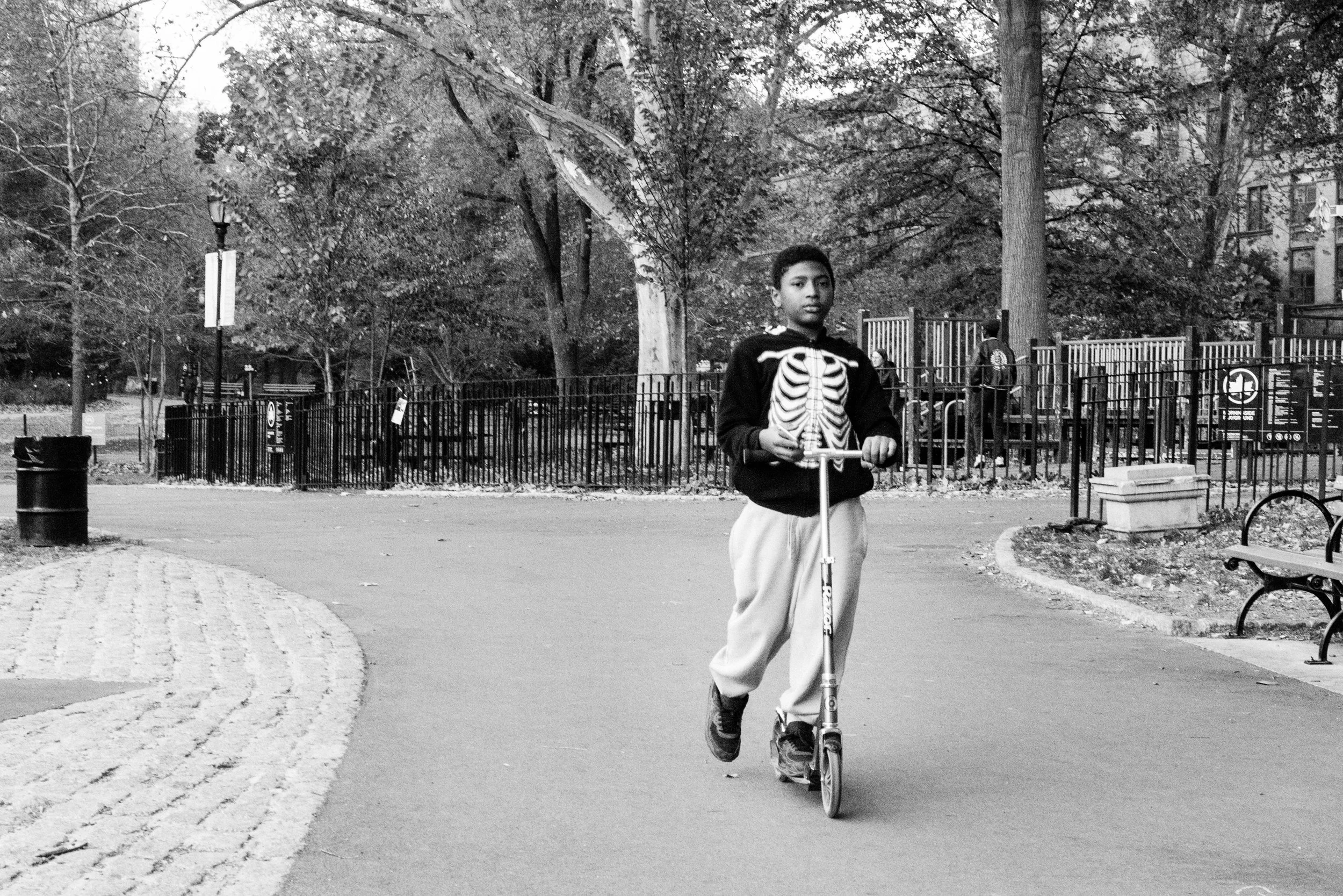 A young boy riding a scooter in a park with trees and benches in the background in black and white. View fullsize