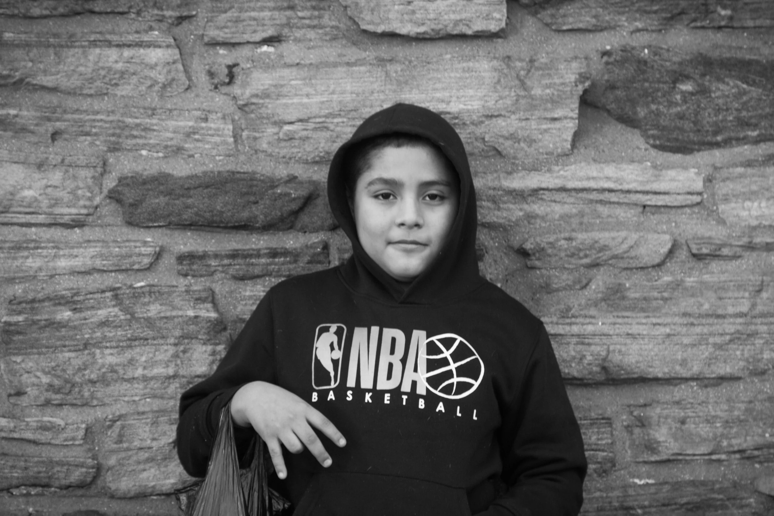 A young boy wearing a hoodie with the NBA Basketball logo, standing against a textured stone wall.