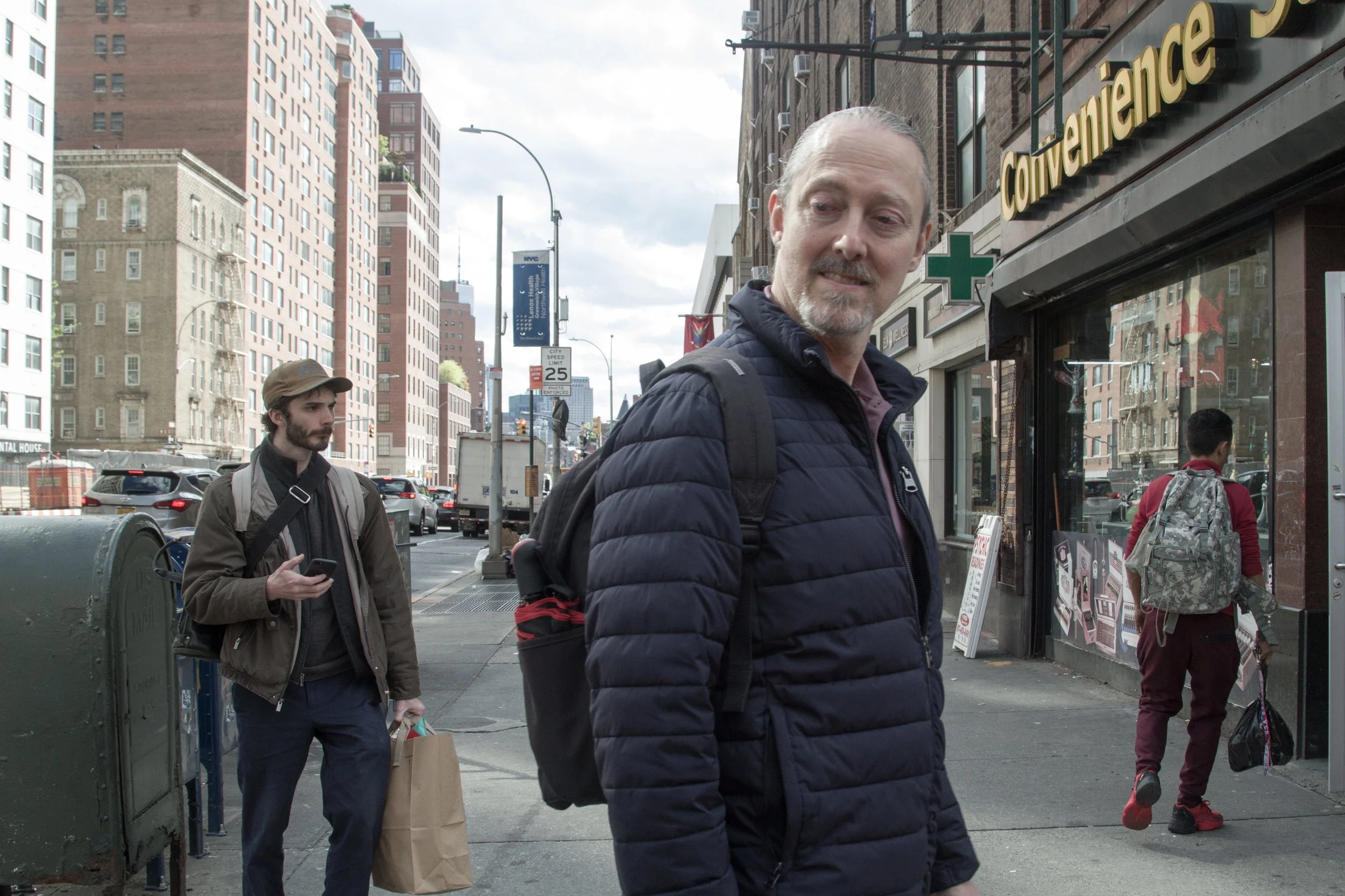A man standing on a city sidewalk with his arms outstretched, wearing a dark coat, hat, and sunglasses, while crossing a street with city traffic and pedestrians, leafless trees, and buildings in the background.