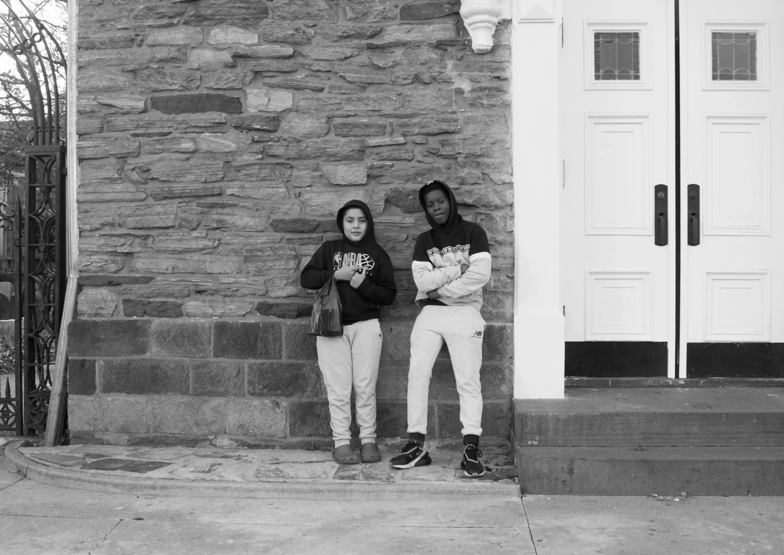 Two children stand against a brick wall with a white door to the right. The girl on the left has a hoodie and sweatpants, holding a small bag, and the boy on the right has a hooded sweatshirt and joggers with arms crossed.