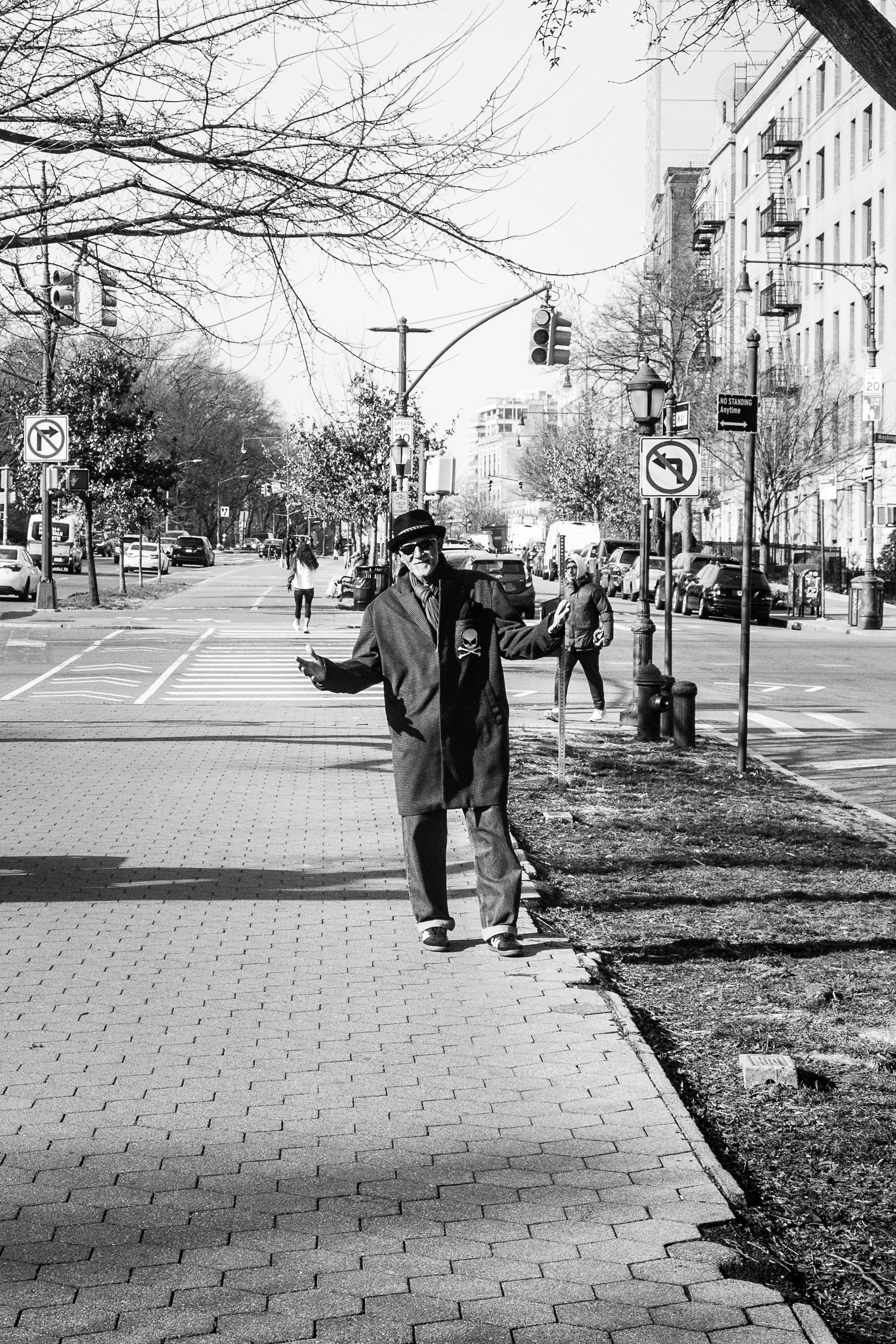 A man standing on a city sidewalk with his arms outstretched, wearing a dark coat, hat, and sunglasses, while crossing a street with city traffic and pedestrians, leafless trees, and buildings in the background. View fullsize