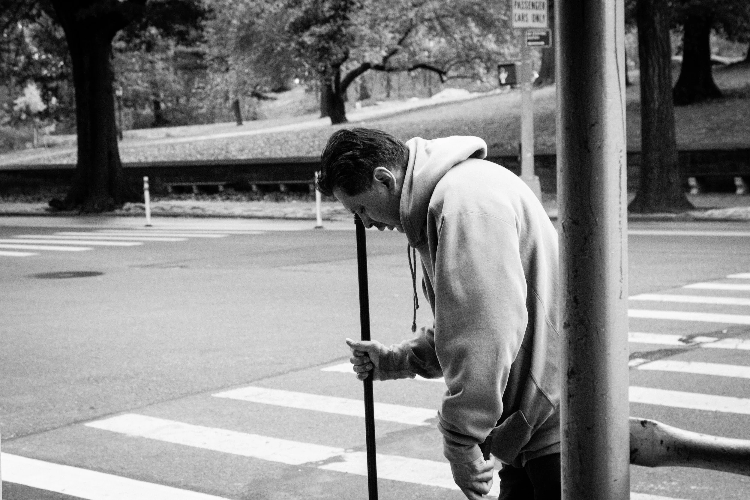 A young man in a hoodie bends over on a city street, looking down at something in his hand, near a pole and crosswalk. View fullsize