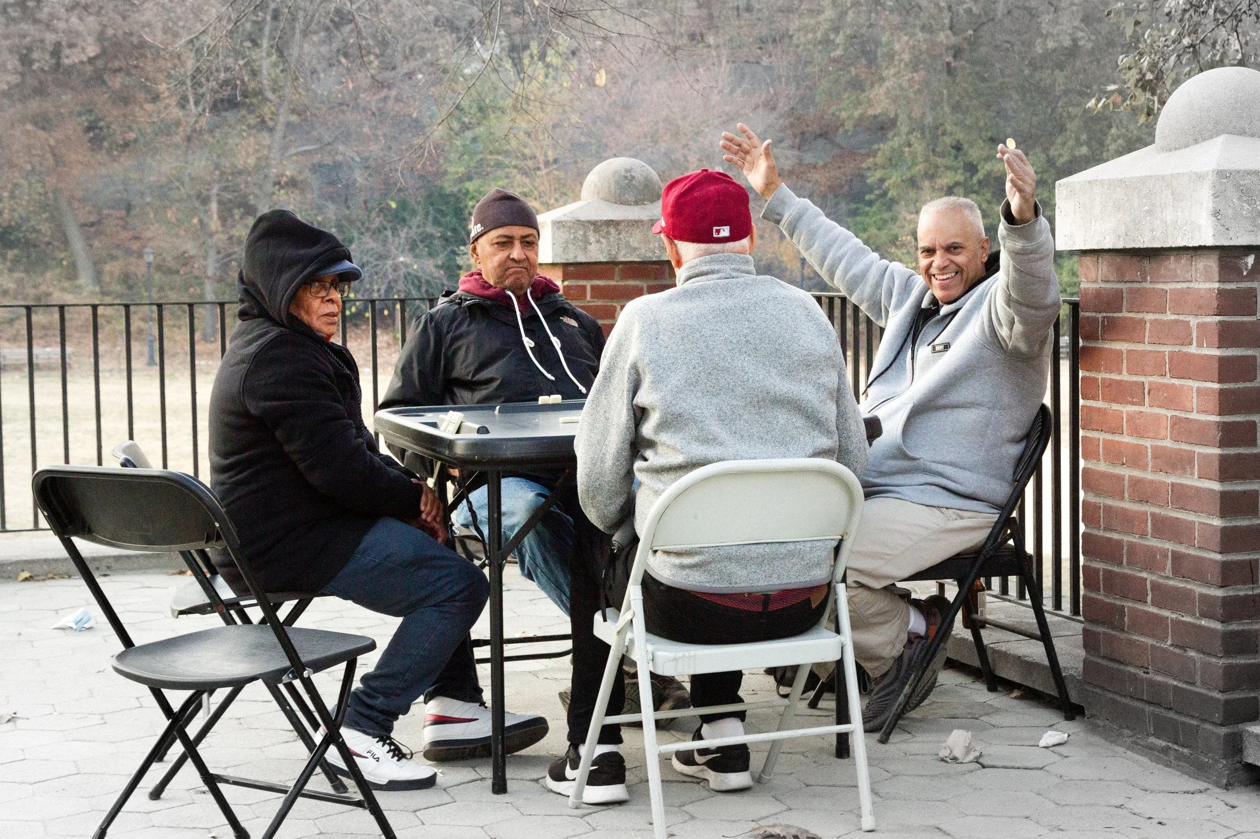 Four individuals seated outdoors around a table, engaged in conversation, with a brick and metal railing background and trees in the distance.