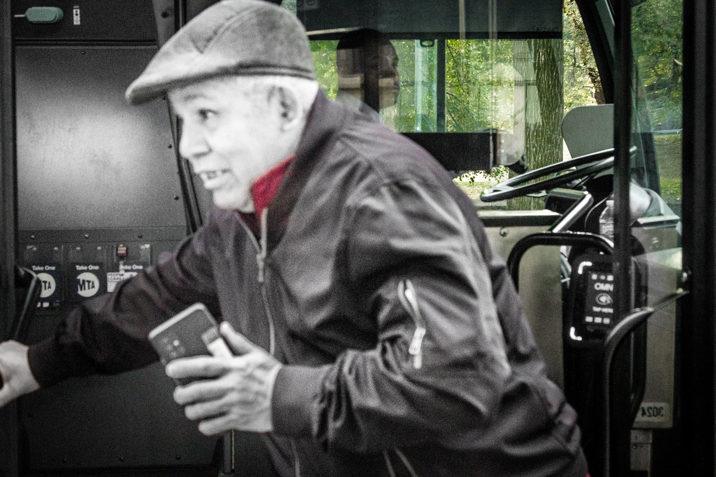 Man dressed in dark jacket and gray cap inside a NYC bus, holding a smartphone, with trees visible outside the window. View fullsize