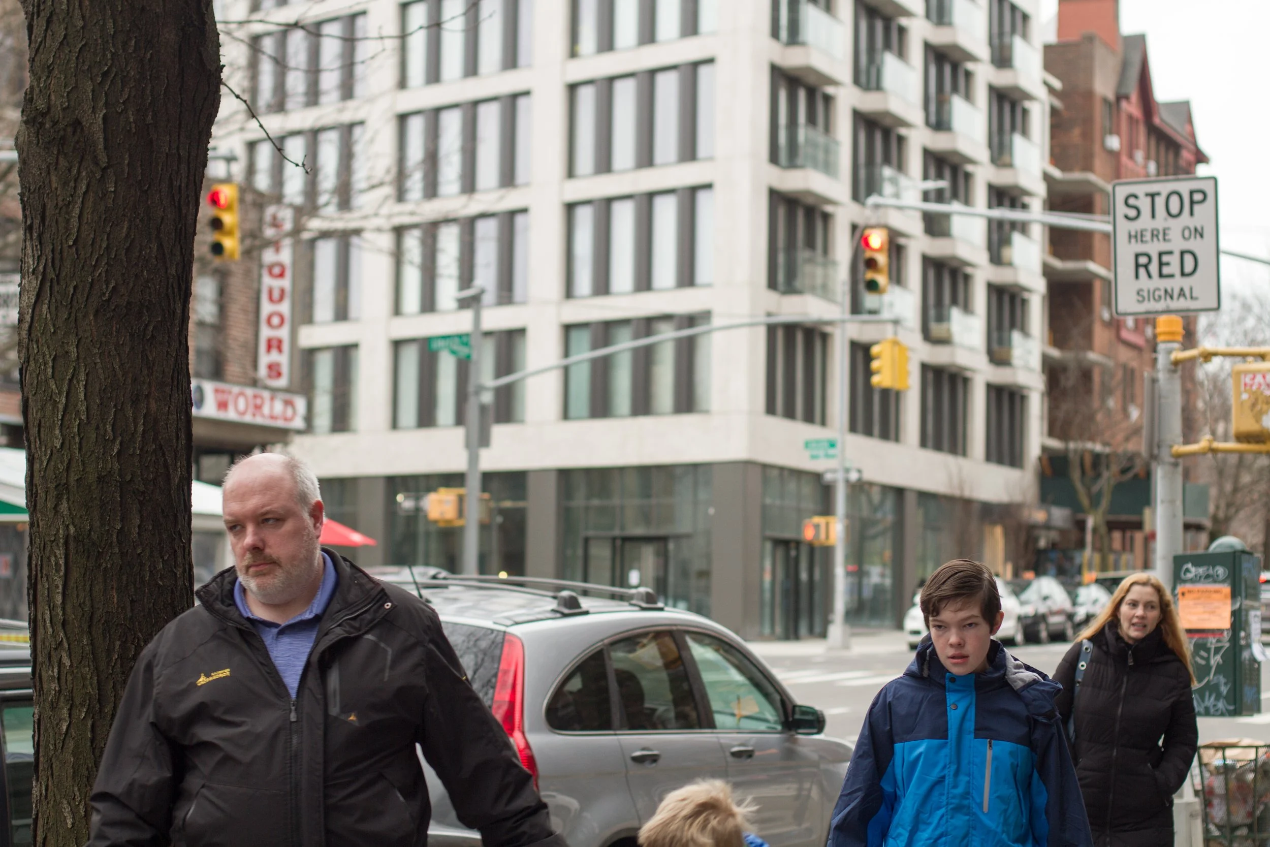 Three people on a city sidewalk, two men and a boy with backpacks, near a convenience store with a green pharmacy cross sign. Tall buildings and parked cars in the background. View fullsize