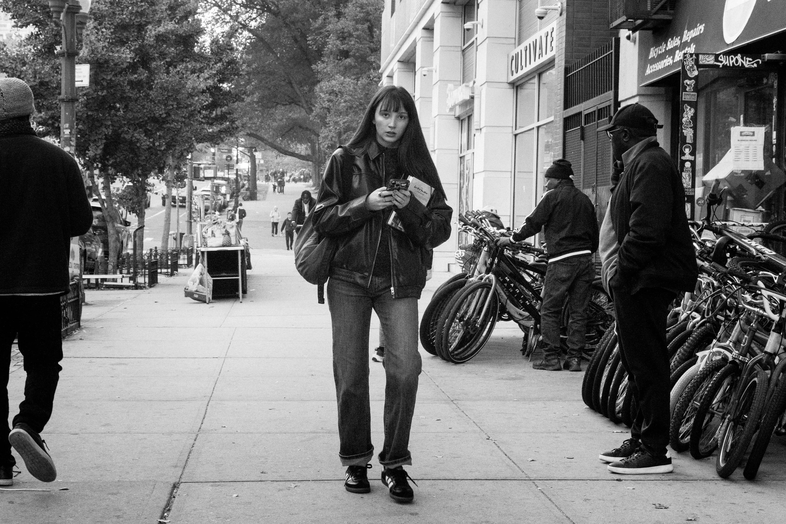 A young woman walking on a city sidewalk while looking at her phone, with bikers and trees in the background. View fullsize