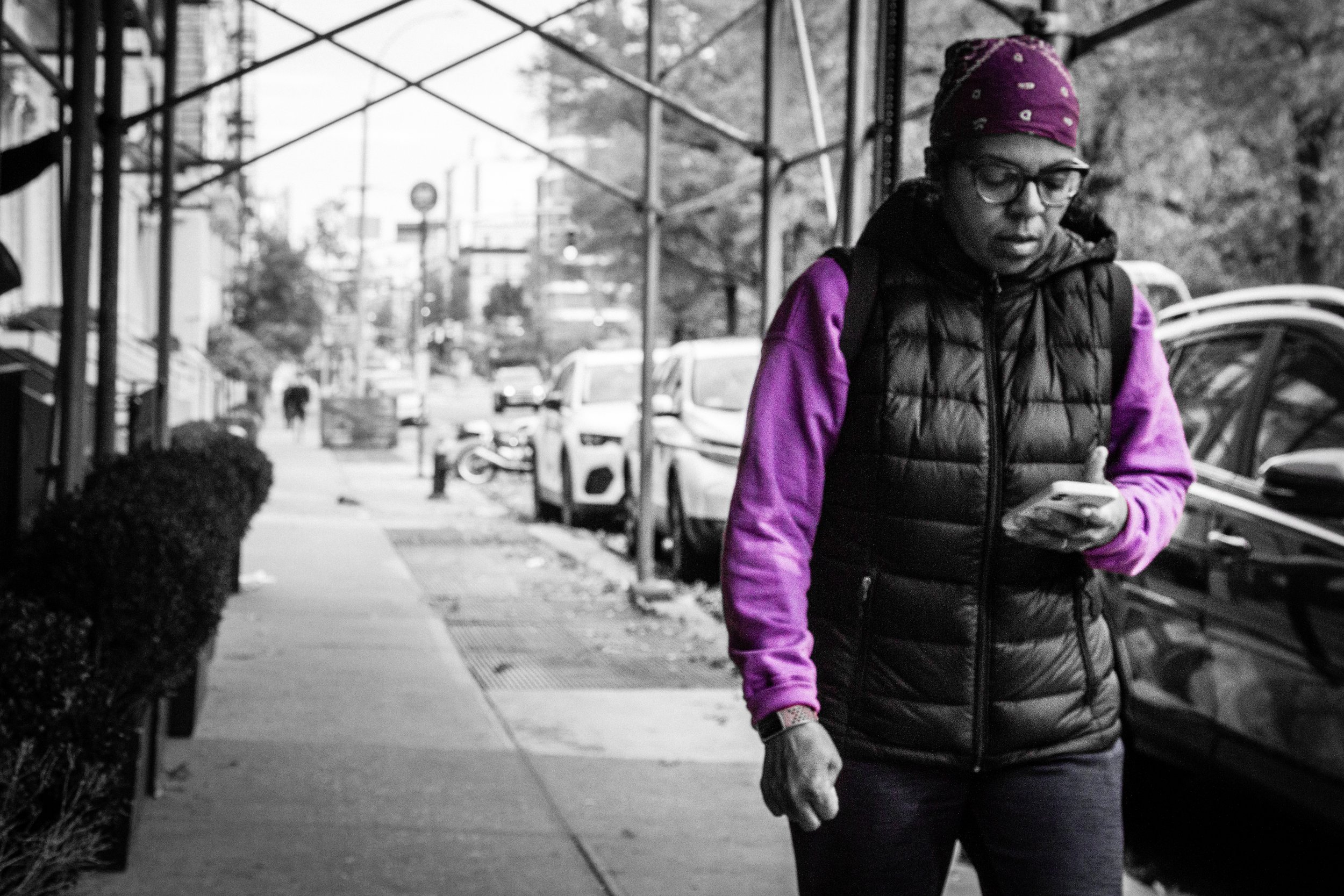 A woman in a purple and black jacket looking at her phone on a city sidewalk, with cars parked along the street and a few people walking in the background.