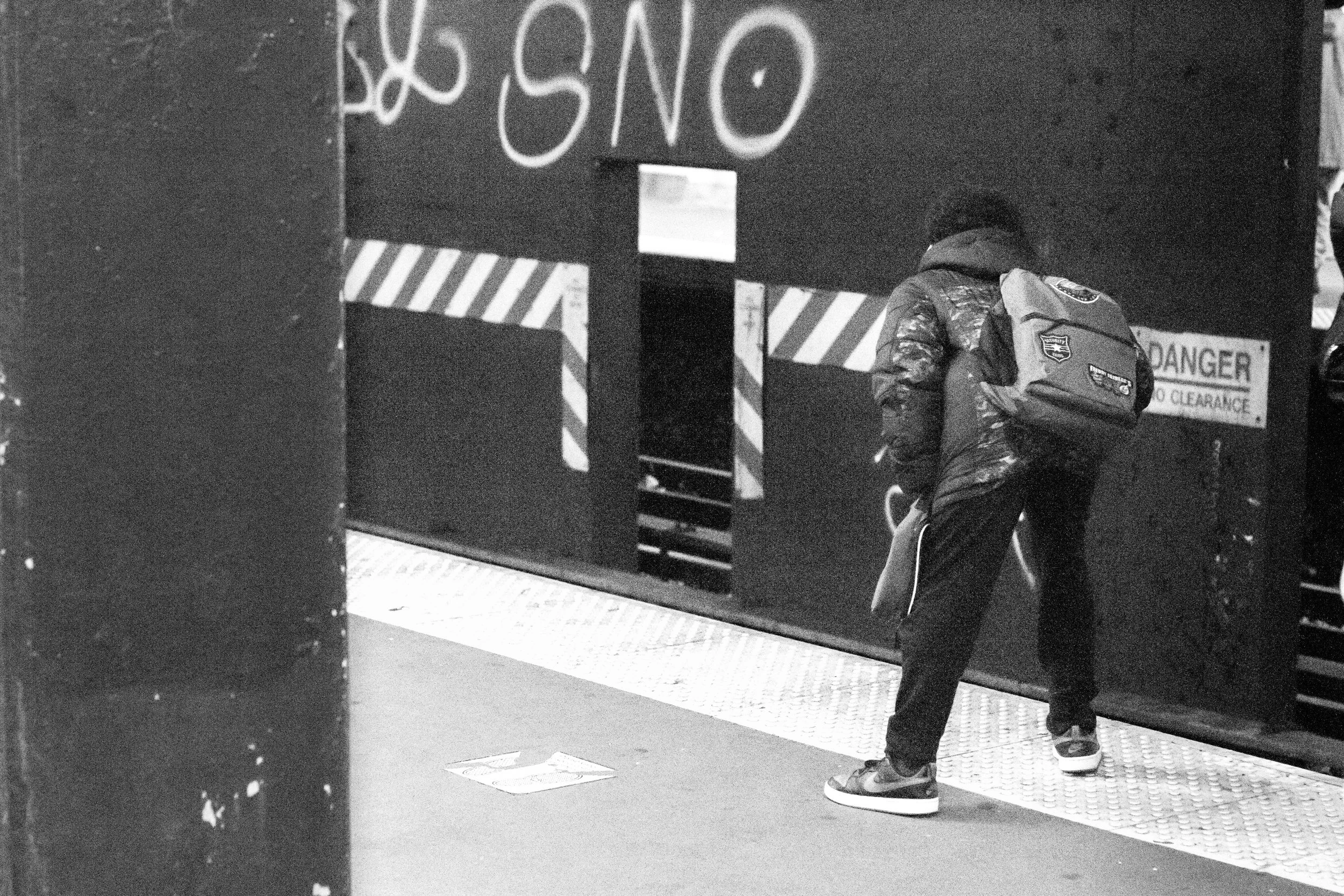 A person with a backpack standing on a subway platform, waiting to board a train. The platform has a warning sign and a large black safety barrier with a window.