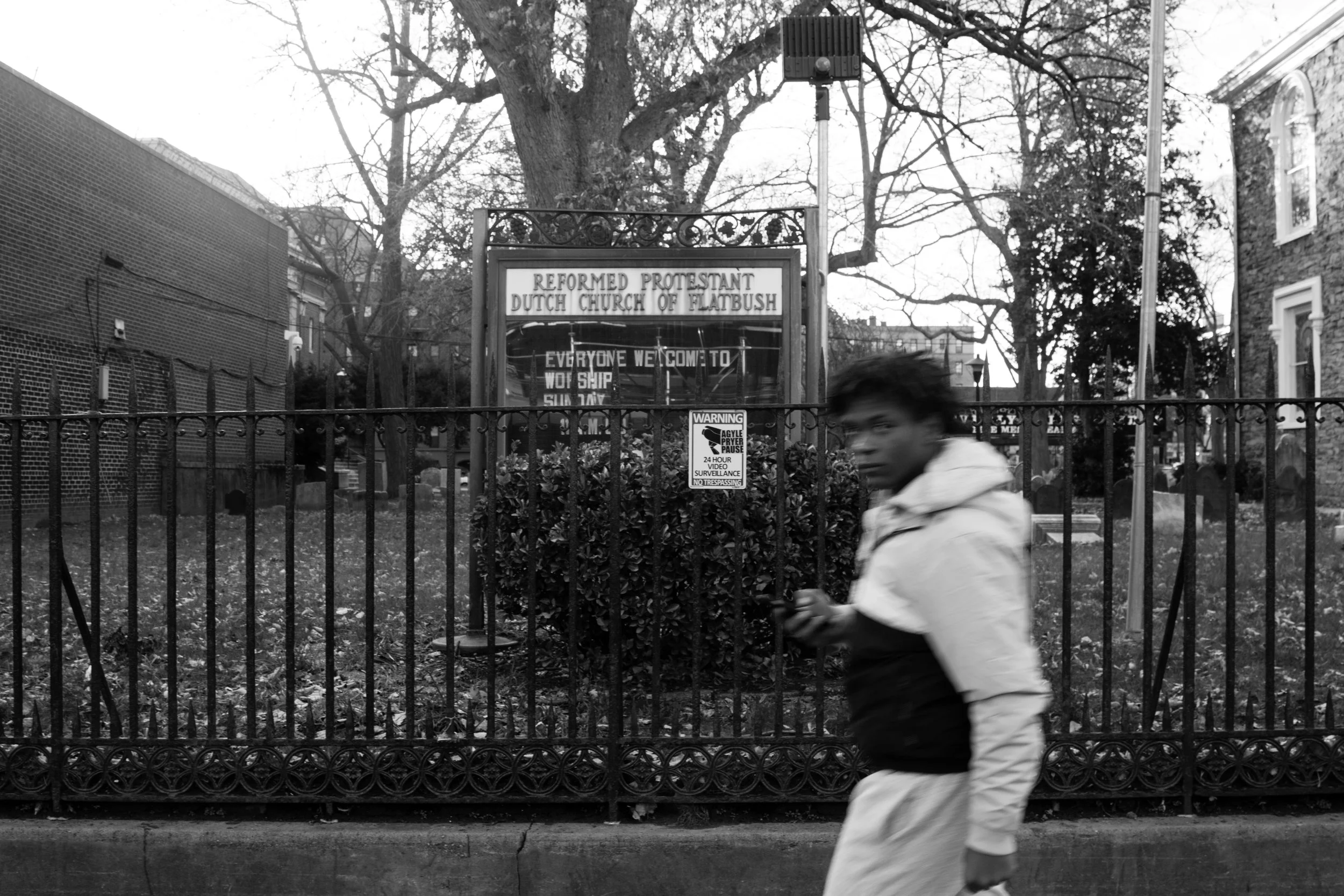 A young man walking past a church fence on a city street in black and white. The church sign reads 'Reformed Protestant Dutch Church of Flatbush' and welcomes visitors to worship services.