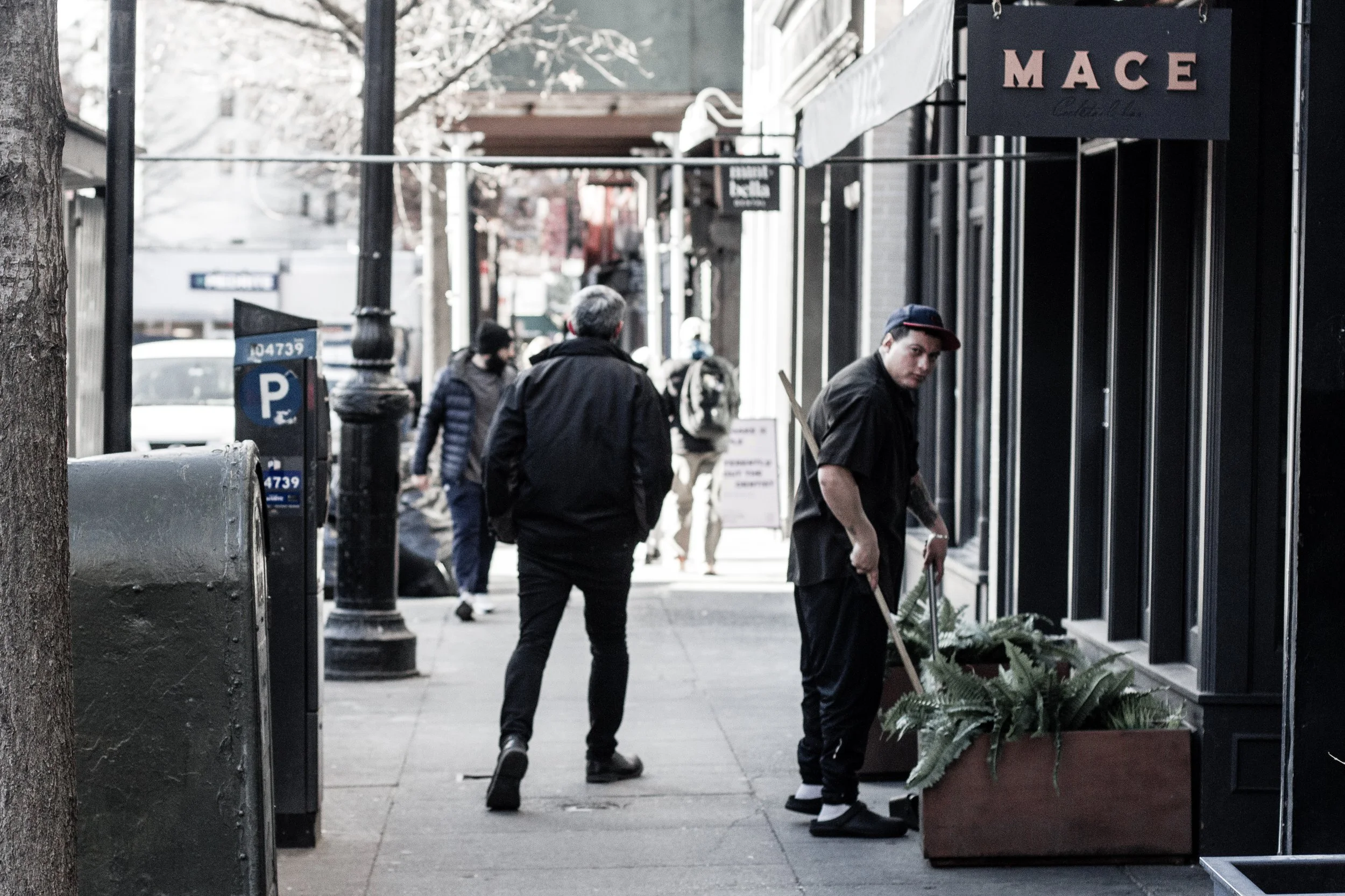 A city sidewalk with several pedestrians walking. In the foreground, a man in dark clothing and a blue cap is tending to plants outside a storefront named 'MACE'. In the background, other pedestrians are walking along the street. There are trees, lam
