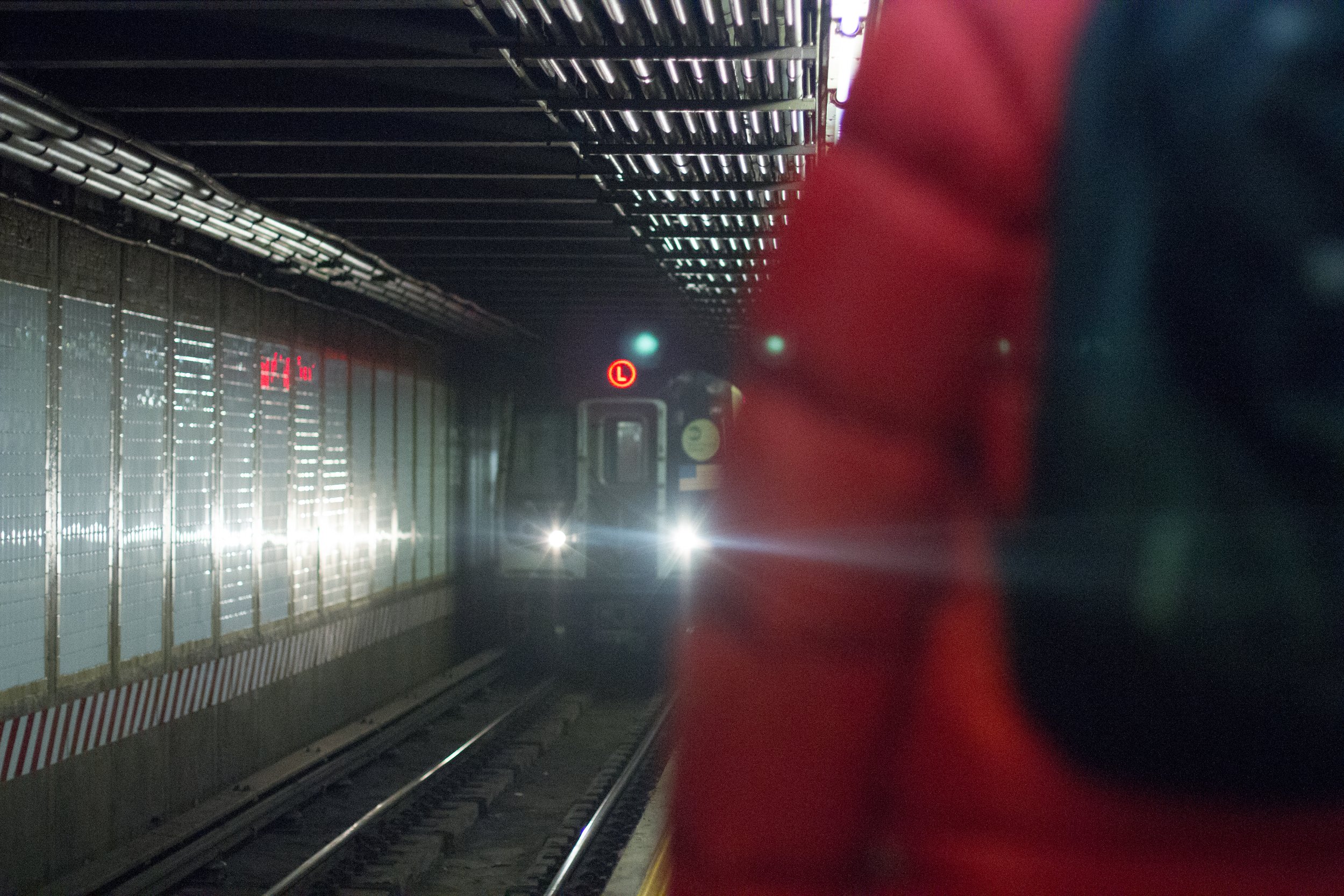 People waiting on a subway platform, some are standing near the train doors, while a young girl in a pink jacket is looking at her watch or bracelet. The scene is inside a subway station, with a train visible in the background.