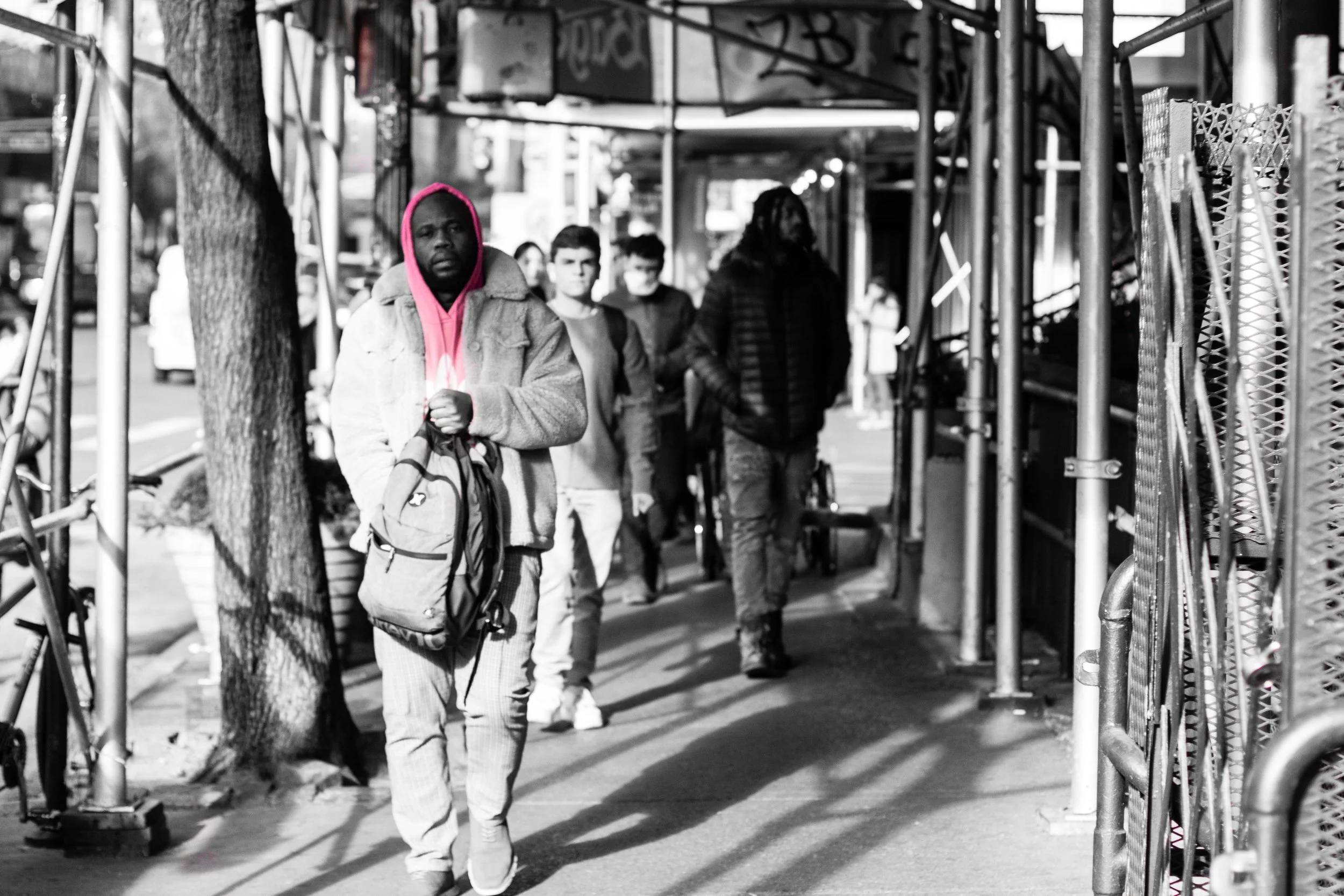 A black and white photo of a city sidewalk with a group of people walking. One person in the foreground is wearing a pink hoodie and carrying a backpack. There is scaffolding and trees along the sidewalk.