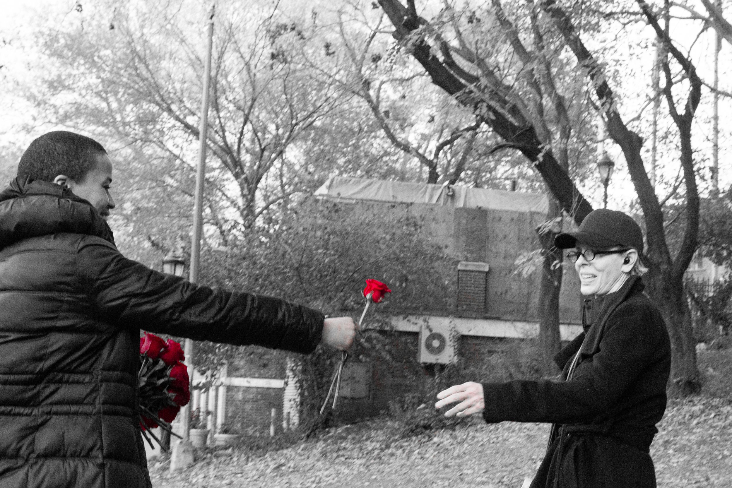 A person in a black puffy jacket is handing a red rose to an elderly woman wearing a black coat and glasses outdoors in a park with trees. View fullsize